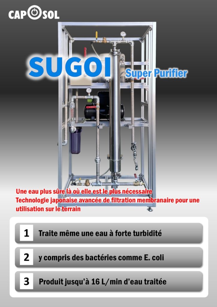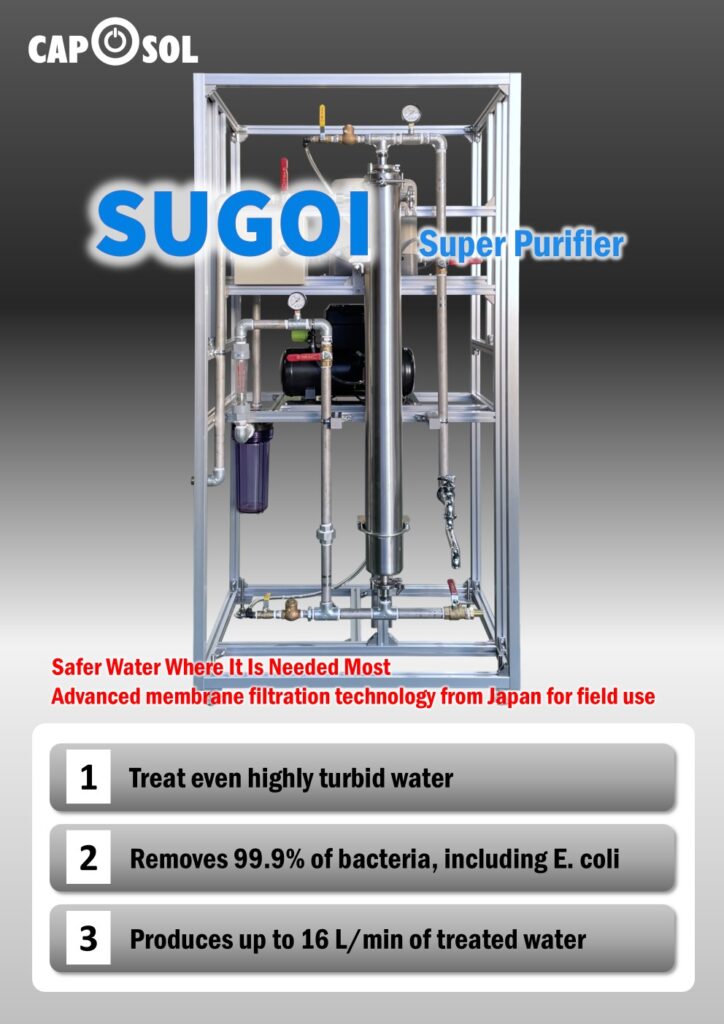 Super Purifier SUGOI は、電力インフラのない農村地域や避難キャンプ、災害時の緊急対応など、安定した飲料水の確保が困難な環境でも、安全で信頼性の高い水を供給できるよう設計された浄水システムです。